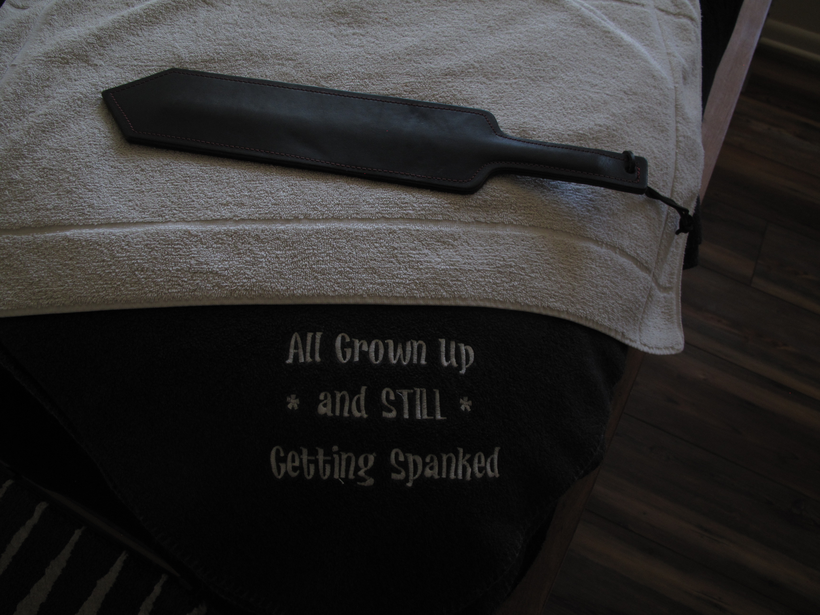 Wednesday, May 24, Late but due maintenance received.  Originally due on Monday after rolling a 2 on Friday, We decided to put it off until Tuesday night.  Then at that time, Ms Mirage felt I should be sitting on a very sore bottom for our long drive enroute to Michigan, so she told me I would be spanked Wednesday morning before we left.  Fast forward to this morning, I made and served coffee and brushed her hair while in bed.  I prepared and served breakfast and cleaned the dishes and kitchen while finalizing the packing for our trip.  She showered during my chore time and waited until I was finished.  She told me the time had come and I was getting spanked.  Over the wedge pillow I bent, head down, ass out.  The bare hand warm warm up began immediately and both hands spanked my cheeks for several minutes.  Finishing up the warm up phase, she reached for the first of the 3 implements next to me.  The Broad Sword Paddle.